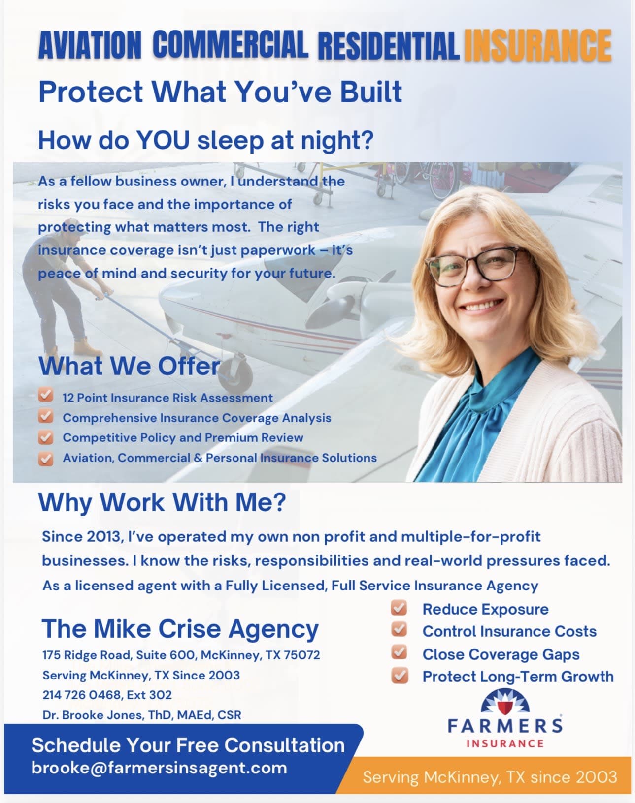 By Dr. Brooke Jones – Aviation Insurance Specialist One of the questions I get asked most often in my aviation insurance work is, “What are the different types of private jets?” Most people assume a jet is just a jet. But in reality, private aircraft fall into several categories based on passenger capacity, speed, and how far they can travel. Understanding these differences helps aircraft owners, operators, and passengers better understand the aircraft they fly on—and from my perspective, it also helps explain why aviation insurance is so specialized. Below is a simple breakdown of the most common categories of private jets. Light jets are ideal for shorter regional trips and efficient business travel. These aircraft typically carry up to 7 passengers, cruise at around 435 mph, and have an average range of about 1,150 miles. They are designed for quick point-to-point travel while still offering the speed and comfort of private aviation. Popular aircraft in this category include the Citation M2, Hawker 400XP, Learjet 75, and Phenom 300. Mid-size jets offer more cabin space and range than light jets, making them a great option for longer regional flights or cross-country travel. These aircraft typically accommodate up to 8 passengers, cruise at around 455 mph, and have an average range of approximately 1,775 miles. Aircraft in this category include the Citation Excel and XLS, Hawker 800XP and 900XP, and Learjet 60 series. Super mid-size jets bridge the gap between mid-size aircraft and large cabin jets. They offer greater speed, range, and cabin comfort, making them capable of longer nonstop trips. These jets typically carry up to 8 passengers, cruise at around 550 mph, and have an average range of about 3,900 miles. Examples of aircraft in this category include the Citation Sovereign, Falcon 2000, Gulfstream 200 series, and Legacy 450. Large cabin jets are designed for long-distance travel and maximum onboard comfort. These aircraft typically accommodate up to 12 passengers, cruise around 530 mph, and offer an average range of approximately 5,000 miles, allowing for coast-to-coast and international flights. Aircraft in this category include the Challenger 605, Global 6000, Gulfstream 400 and 500 series, and Legacy 600. Regardless of the size of the aircraft, aviation insurance is essential to operating safely and responsibly. Aircraft are high-value assets that operate in complex environments involving passengers, crew, airports, and strict regulatory requirements. Aviation insurance helps protect owners and operators from financial exposure related to accidents, liability claims, aircraft damage, and other operational risks. Unlike standard insurance policies, aviation insurance is highly specialized. It requires professionals who understand the unique risks associated with aircraft operations, including pilot experience, aircraft type, maintenance standards, and how the aircraft is used. In many cases, you cannot legally operate an aircraft without proper aviation insurance coverage. Airports, lenders, and regulatory authorities often require proof of insurance before an aircraft can operate. Aviation insurance policies can include a range of specialized protections depending on the aircraft and how it is used. Coverage may include: Because every aviation operation is different—from private owners to corporate flight departments—insurance policies must be carefully structured to ensure the right protections are in place. Understanding the aircraft is important. If you have questions about any aviation risk or coverage, feel free to give us a call 214 726 0468 or email me brooke@farmersinsagent.com What types of private planes have you flow in?