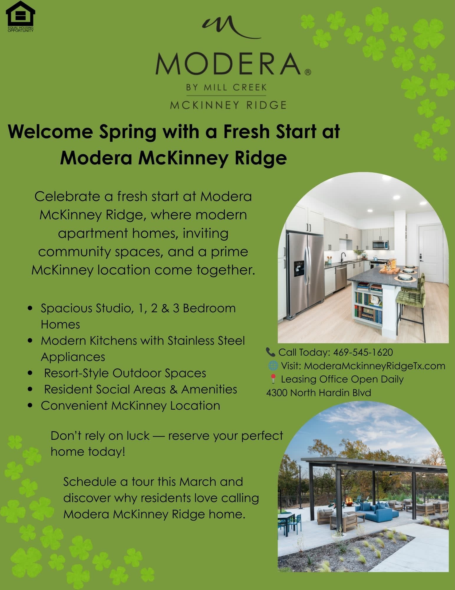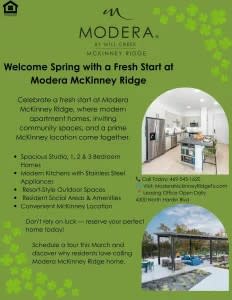 Spring is the perfect time for a fresh start—and there’s no better place to begin than Modera McKinney Ridge. Our thoughtfully designed apartment homes combine modern style, spacious layouts, and inviting community spaces in one of McKinney’s most convenient locations. Whether you're looking for a cozy studio, a stylish one-bedroom, or room to grow with a larger floor plan, you’ll find the perfect place to call home. At Modera McKinney Ridge, you’ll enjoy features like modern kitchens with stainless steel appliances, resort-inspired outdoor spaces, and welcoming social areas designed for relaxing and connecting with neighbors. Don’t rely on luck to find your next home—schedule a tour today and see why residents love living here. 📞 Call: 469-545-1620 We’d love to welcome you home this spring. Expiration Date : 3/22/2026